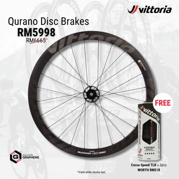 Aero and Disc wheel combined in a Full Carbon Clincher wheelset: that’s the Qurano 46C Disc. It’s built on 46mm high asymmetric rims front and rear with 24 double crossed spokes. Assembled with the new Vittoria Road Disc hubs with SwitchIT 2 freewheel system and 12/100mm front through axle, Centerlock® (convertible to 6-bolt) disc mount. Compatible with SRAM, Campagnolo or Shimano cassette.